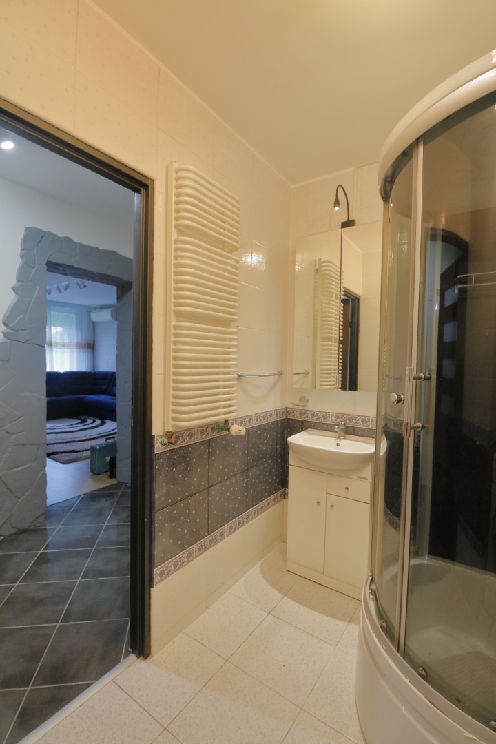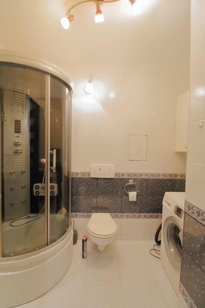 W łazience znajduje się kabina z hydromasażem oraz radiem. Lustro w łazience zostanie wymienione na nowe oraz zostanie dokupiona pralka.