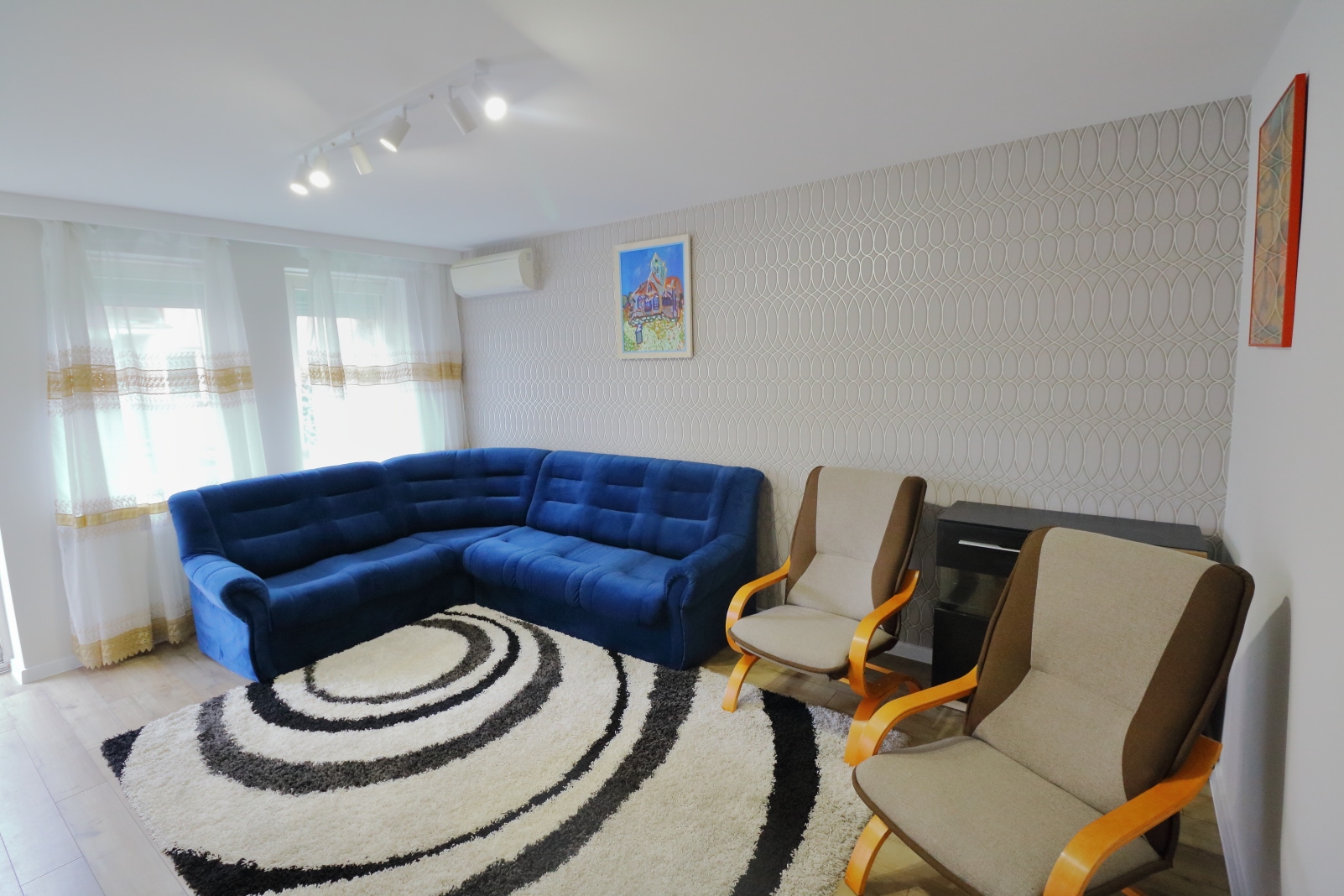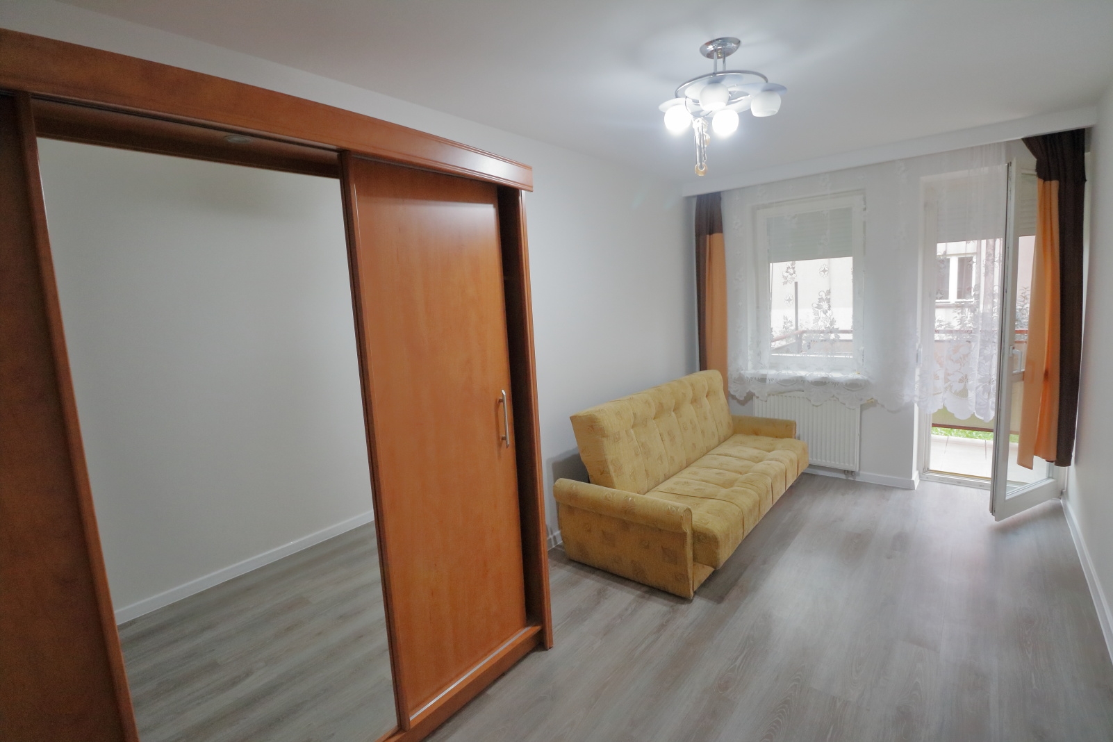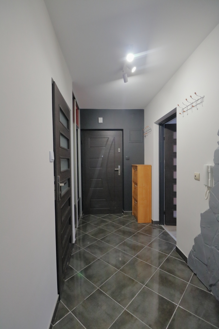 W mieszkaniu zostały zamontowane panele podłogowe oraz dekoracyjny kamień na ścianie. Dodatkowo wstawiono drzwi antywłamaniowe.